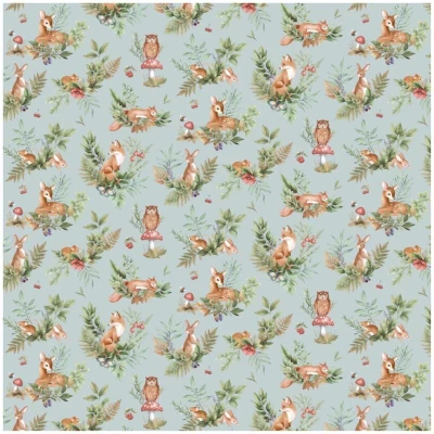 This captivating wallcovering features an intricate, whimsical woodland pattern, perfectly tailored for creating a magical and engaging atmosphere in a nursery or kid's room. The design is set against a soft, light blue background, creating a serene and calm backdrop for the lively scene. The motif is a delightful collection of friendly forest animals, including spotted deer, curious foxes, bushy-tailed squirrels, wide-eyed owls, and playful hares. These charming creatures are nestled amongst lush foliage, ferns, toadstools, and clusters of berries, evoking the wonder of a secret, enchanted forest. The artistic style is sweetly illustrative, with the animals and plants rendered in gentle, watercolor-like washes that feel soft and inviting. This paper is ideal for stimulating a child's imagination and creating a welcoming, imaginative space for play and rest. The appealing color palette features a dominant light, airy blue ground, which acts as a gentle sky. The woodland creatures are