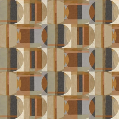 WallpaperDirectA lightly textured design with a bold retro colour block geometric pattern. Circles and rectangles of colour overlapping in a fabulous 70s inspired design. Shown here in the brown, bronze and grey colourway.