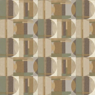 WallpaperDirectA lightly textured design with a bold retro colour block geometric pattern. Circles and rectangles of colour overlapping in a fabulous 70s inspired design. Shown here in the sage green, taupe and brown colourway.