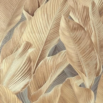 A stunning textured vinyl with a lustre effect - giant scale jungle leaves in a pleasing all over effect. Shown in the natural gold with grey colourway.