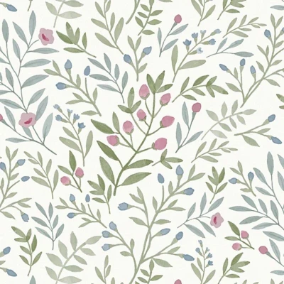 WallpaperDirectA lightly textured vinyl design with an all over leafy pattern with of sprigs with tiny coloured flowers and buds perfect for a fresh Scandinavian styling. Shown in the green / blue with pink detail.