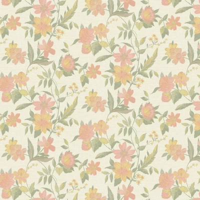 A blown vinyl wallcovering with an open fabric weave effect background in cream with a bright pink and yellow floral trail.