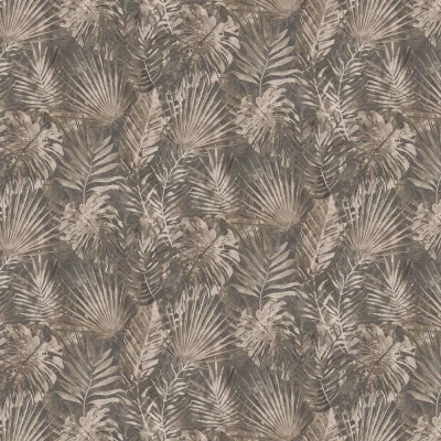 A plaster effect background with a variety of jungle leaves overlaid in this pretty pattern. Shown in the mocha brown colourway. Search: Palm, Cheese plant.