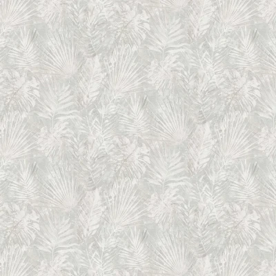 WallpaperDirectA plaster effect background with a variety of jungle leaves overlaid in this pretty pattern. Shown in the light grey with touches of green colourway. Search: Palm, Cheese plant.