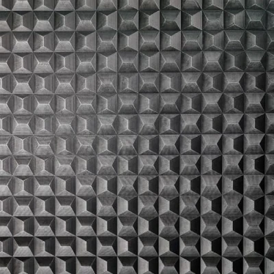 A lightly textured vinyl design with a bold raised 3D textured effect. With rotated four side shapes catching the light in this retro geometric pattern. Design has a straight match 53cm or 20.8 inch repeat.