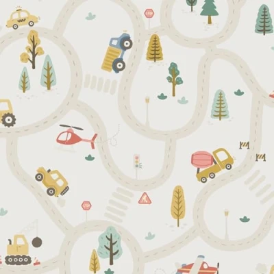 WallpaperDirectHead out on a roadtrip with this playful design, showcasing winding roads and roundabouts with cars, tractors and aeroplanes in a playful art style. Please note: Actual pattern repeat is 32cm.