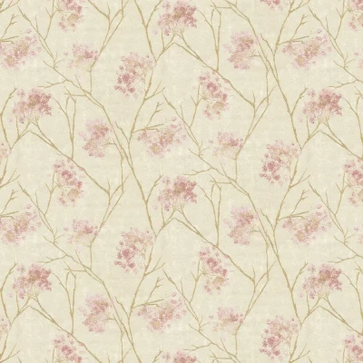 A textured vinyl wallcovering with a soft cloud- like paint effect background and a blossom tree all over pattern. Co-ordinating plain available. Shown here in the pink colourway with gold stems.