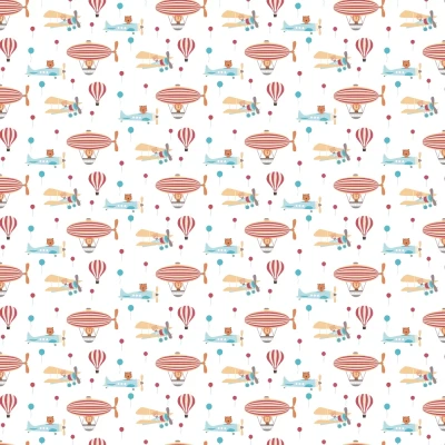 A cute illustrated design ideal for a children's bedroom or nursery. Lions, tigers and bears cruise through the sky in red and blue planes and hot air balloons. Set against a white background.