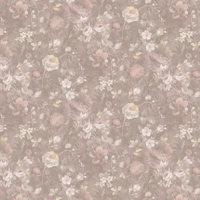 WallpaperDirectA weave textured wallcovering covered in flowers with a shadowy vintage look, includes roses and dahlias. Shown in the mushroom pink / brown colourway.