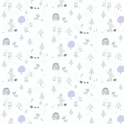 Explore the woods with this gorgeous wallpaper design. A soft purple colour palette and a fresh white ground make this wallpaper soothing and versatile. Bunnies, deer, owls and hedgehogs feature in this sweet pattern, ideal for a children's bedroom or nursery.