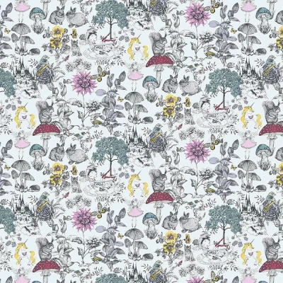 A gorgeous sketched woodland design, ideal for a children's bedroom or nursery. In amongst the trees and toadstools you'll find cute bunnies, squirrels and birds. The castles, pretty fairies and unicorns give this design a lovely, whimsical quality. Shown here in the Multi colourway.