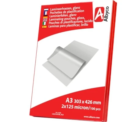✅ The thicker, the more solid: thicker laminating pouches are more robust and make the film less prone to bending, e.g. business cards and cards. The document is completely sealed in a plastic layer, which prevents soaking or soiling. ✅ PERFECT FOR INTENSIVE USE: Lamination is the perfect solution for documents. The Albyco range of laminating pouches or laminating pouches has an invisible anti-static surface for easy insertion. ✅ VARIOUS SIZES AND THICKNESS: Albyco delivers high quality laminating materials in all standard sizes and thicknesses. Each laminating sleeve provides protection. Available in A2, A3, A4, A5, A6 and A7 sizes. ✅ GLOSSY FINISH: The glossy finish gives a high quality look, perfect for most lamination jobs. ✅ PERFECT FOR WORK AND HOME - Laminating pouches are perfect for home or office use and are compatible with all brands of laminators. Not sure which laminator is best for you? Check out our offers! ✅ Albyco Professional Laminating Pouches DIN A3, 303 x 426 mm Thickness: 2 x 125 (250 Micron) Pack of 100