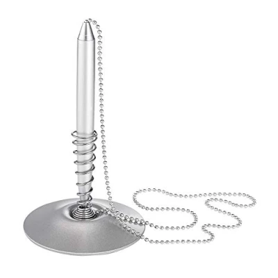 This ballpoint pen stand is the solution to pen pain for public traffic workareas For the eye-catcher effect, the Sift stands in a flexible spiral pen holder In addition to the pen, there is an adhesive pad and non-slip silicone nubs for optimal positioning on the table surface Pen and stand are both in silver. A black standard lead is also included The chain has a length of 55 cm, the holder has a diameter of 8 cm and the pin has a height of 14.5 cm