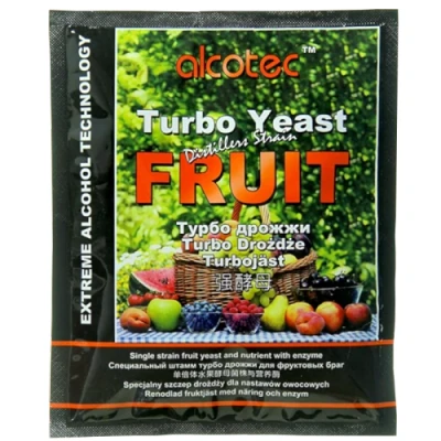 Single Strain Fruit Yeast And Nutrient With Enzyme 60g Sachet Of Alcotec Turbo Yeast Can Ferment Up To 25 Litres Of Fruit Mash Create Your Mash And Let It Cool Down To Below 30 Degrees Centigrade, Then Add The Contents Of This Sachet And Stir Well, Leave To Ferment At Between 22 - 28 Degrees Centigrade. Fermentation Time Is 4 to 6 Days. Ingredients: Yeast, Nutrient, Vitamins, Enzyme