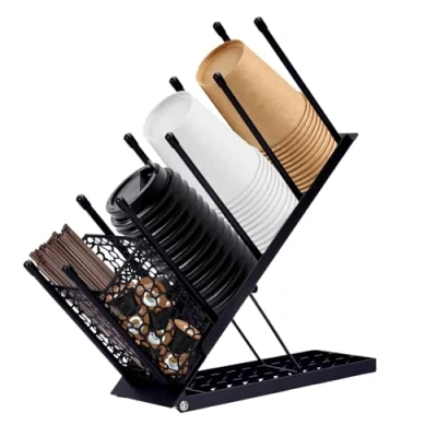 ANTI-RUST AND WATERPROOF METAL: This cup organizer is made of anti-rust and waterproof metal, Much more stronger and durable than the plastic ones, Never worry about bending deforming or cracking, No peeling paint and scratches after a long time of usem Maximizing your space and keep your home coffee station organized 8 DIFFERENT HEIGHTS FOR ADJUSTMENT: The coffee cup for adjustment can be laid flat or adjusted to a suitable height, providing flexibility to adapt to different countertop setups or storage preferences, This coffee bar organizer for countertops allows for convenient accessibility and customization based on your specific needs COFFEE CUP HOLDER FEATURES 4 COMPARTMENTS: Paper cups and lids, with the ability to stack up to 25 cups per section; This metal cup holder for countertop also includes a removable straw sleeve holder, allowing you to organize straws and coffee pod efficiently, This drink lid holder accommodates both disposable coffee cups and lids, as well as cups for cold beverage Our paper cup holders come with professional mounting accessories: Just pick up the screws and tubes that come with them, align them with the holes, tighten the screws, with a metal wire mesh basket, it can be used as a coffee pots holder or straws organizer; The basket can also removable to use separately as a utensil holder or other organizers MULTIFUNCTIONAL USE: The cup organizer can place paper cups, plastic cups, coffee cups, conical cups, cup lids, straws, etc; is suitable for various settings such as offices, restaurants, breakrooms, coffee stations, bars, kitchen counter, buffets, and any party or event where cup organization and access are necessary