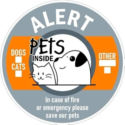 Alert, pets inside, in case of fire or emergency please save our pets, orange and grey sign. Self adhesive sticker. Printed using the latest digital technology and laminated for extra durability. Remove backing film and apply to dry, smooth, oil free surface. All signs come with a 5-year warranty. All our signs are UV resistant meaning they will not fade in sunlight. Our vinyl stickers are temperature resistant from -40°C to +80°C.