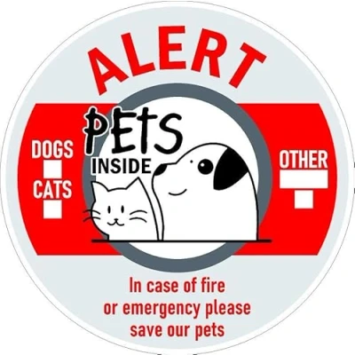Alert, pets inside, in case of fire or emergency please save our pets sign. Self adhesive sticker. Printed using the latest digital technology and laminated for extra durability. Remove backing film and apply to dry, smooth, oil free surface. All signs come with a 5-year warranty. All our signs are UV resistant meaning they will not fade in sunlight. Our vinyl stickers are temperature resistant from -40°C to +80°C.