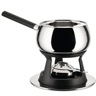 Mami Range Bourguignonne set One long handle in 18/10 stainless steel Heat diffusing bottom and handle in black wood Cast-iron holder, burner and tray Designed by Stefano Giovannoni Dimensions: 39.5cm x 20cm x 35.5cm