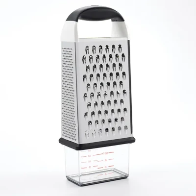 Harts of SturThe OXO Good Grips Box Grater comes with a convenient container with a non-slip base, measurement markings and lid that attaches to the bottom for catching and storing freshly grated ingredients. Includes 4 stainless steel surfaces: 2 wide ones for coarse and medium grating and 2 slimmer ones for fine grating and slicing. Dimensions: 7.3cm x 11.4cm x 29.9cm.