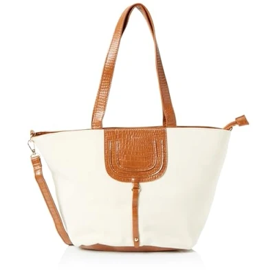 Feminine shopper Made of light canvas fabric Faux leather patches with crocodile embossing Large lined interior Side inner pocket