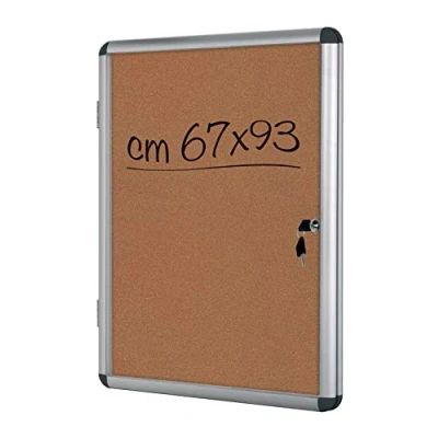 Cork board with anodised aluminium frame, clear acrylic door and key closure Internal capacity 2cm/21 sheets - 9 a4 sheets side by side Internal size 67 x 93 cm