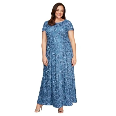 Elegant All-Over Rosette Lace: Crafted from soft rosette lace with delicate sequin detailing, this formal gown offers an eye-catching texture and luxurious shine—perfect for weddings and special occasions. Flattering A-Line Silhouette: The long A-line design enhances your figure with a flowy, graceful fit that flatters all body types, making it an ideal choice for mothers of the bride, wedding guests, and formal events. Scoop Illusion Neckline: Designed with a sophisticated scoop illusion neckline and short sleeves, this gown adds a refined, timeless touch while remaining bra-friendly for ultimate comfort. Convenient Back Zipper: Featuring a center back zip for easy wear, this gown combines convenience with elegance, ensuring a seamless, polished look for your next event. Sizes for Every Woman: At Alex Evenings, we embrace the beauty of every woman. Our inclusive sizing, from Petite to Regular, and Plus sizes, ensures that our dresses are designed to complement various body types.