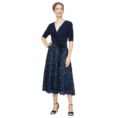 Alex Evenings Women's Tea Length Jersey and Rosette Lace Dress (Petite Regular) Special Occasion, Navy Tie Front, 14