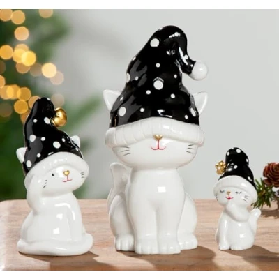 AlexandreHouse Pack of 3 Figures, Cat, Dotted, Porcelain, White, PU 3, Assorted times, H. 18 cm, D. 9 cm