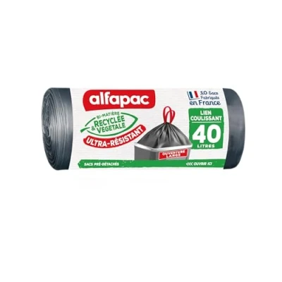 Contents: roll of 10 bags, 40 litres, with sliding strap, easy to close, bag dimensions: 65 x 70 cm Unique two-material: recycled (74%) and vegetable (15%) Made in France: certified bin liners from France Efficiency: robustness and perfect sealing Practicality: the bags come pre-separated in the roll for easy removal. Practical closure thanks to the sliding strap. Thanks to the large opening suitable for large wheelie bins.