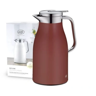 Perfect enjoyment for home or office: whether for coffee or tea, with the Skyline vacuum flask from alfi the contents taste like freshly brewed even after hours. Clever energy saving with pleasure. Double-walled tempered glass insert: the glass insert is optimally cleaned by hand and gives the jug a premium insulation performance that keeps hot drinks warm for up to 12 hours and cold drinks cool a whole day. One-handed operation: ergonomic handle makes pouring more comfortable than ever. A filled jug feels lighter, and it is easier to open even with small hands thanks to the twist lock with one-handed operation. Elegant design: with contemporary design and current trendy colours, the designer piece in 1 litre by Pearl Creative is a stylish home accessory. Much too good for the cupboard! Sustainable environmental contribution: durable and BPA-free thanks to stainless steel body and tempered glass insert. The materials of the vacuum jugs remain tasteless and odourless and thus ensure long-lasting pleasure.