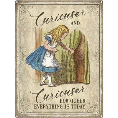 Alice in Wonderland "curiouser & curiouser" metal wall sign plaque 15x20cm