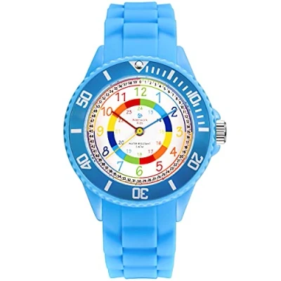Alienwork Kids Children's Teacher Watch Boys Girls Light Blue Silicone Strap Multi Coloured Kid Waterproof 5 ATM Learning Time
