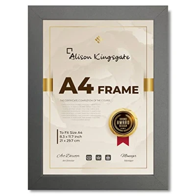 Alison Kingsgate A4 Frame Grey in Size 29.7 x 21cm Use for Certificate Pictures/Photos/Posters, with Clear Perspex Sheet & Wall Mounted Hook (Dark Grey)