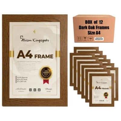 AmazonAlison Kingsgate Dark Oak A4 Frames Pack Of 12 With Clear Perspex Sheet & Wall Mounting Hooks - A4 Dark Oak Frame in Size 21x29.7cm - A4 Picture Frames - Box 12 A4 Frames (A4 x 12 Pack)