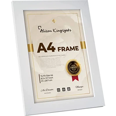 Alison Kingsgate Premium White A4 Frame in Size 29.7x21cm with Safe Perspex Sheet & Wall Mounted Hook Picture Frames Certificate (White)