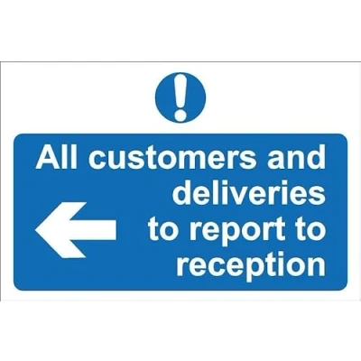 All customers and deliveries to report to reception left arrow. 1mm flexible Plastic sign. Digitally printed for extra durability. Drill and screw in position or use double sided tape to mount onto suitable surface. All signs come with a 5-year warranty. All our signs are UV resistant meaning they will not fade in sunlight. Suitable for indoor & outdoor use.