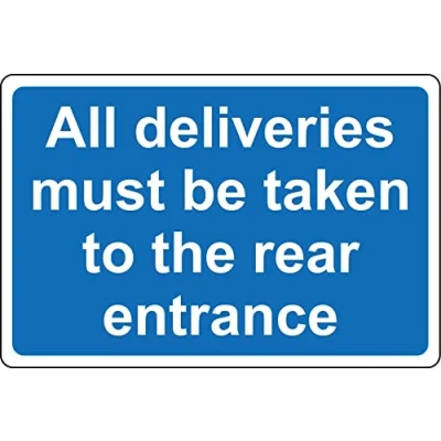 All deliveries must be taken to the rear entrance sign 1mm Plastic sign Digitally printed for extra durability Drill and screw in position or use double sided tape to mount onto suitable surface.