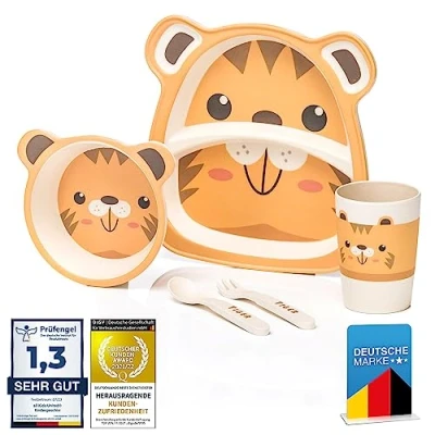 all Kids United® Children's Tableware Set Made of Plastic 5 Piece with Animal Motifs; Cup, Bowl, Plate, Spoon & Fork for Children (Tiger)