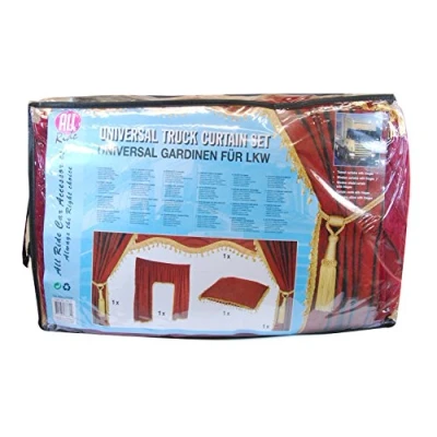 Set Universal Velvet Style Theatre Curtains, for resting area camion. Gold Colour Red with fringes. Includes: 2 curtains for the side windows with fringes 250 x 105 cm; central Curtain 1 Fringes 215 x 150 cm; 1 side Parasol with Fringe 230 x 12 cm. 1 Cushion with Fringe 44 x 40 x 13 cm, 2 Tiebacks Fringe Sweet Hooks. Attachment.