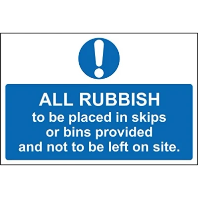 All rubbish must be placed in skips or bins provided and not left on site Safety sign 1.2mm Rigid plastic 300mm x 200mm