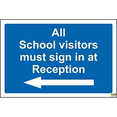 All school visitors must sign in at reception arrow left sign 1.2mm rigid plastic 400mm x 300mm Digitally printed and laminated for extra durability Drill and screw in position or use double sided tape to mount onto suitable surface.