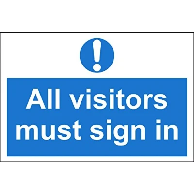 All visitors must sign in safety sign Self adhesive sticker 300mm x 200mm Remove backing film and apply to dry, smooth, oil free surface. Digitally printed and laminated for extra durabillity