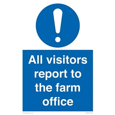 M001 : General mandatory action This sign is made from vinyl high tack A stickier sticker. Uses a stronger adhesive to make it more suitable for plastic surfaces like Wheelie Bins or where the sticker might get rubbed. A4 portrait Sign Text: All visitors report to the farm office