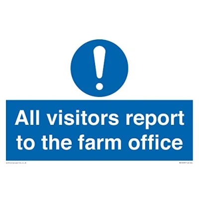 M001 : General mandatory action This sign is made from vinyl high tack A stickier sticker. Uses a stronger adhesive to make it more suitable for plastic surfaces like Wheelie Bins or where the sticker might get rubbed. A4 landscape Sign Text: All visitors report to the farm office