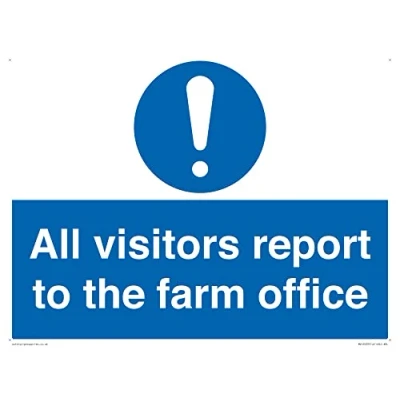 M001 : General mandatory action This sign is made from plastic semi-rigid 1mm Comes with4mm Corner Holes. 1mm thin plastic sign, can be screwed, stuck with adhesive, or attached with cable ties. Not suitable for hanging. A3 landscape Sign Text: All visitors report to the farm office