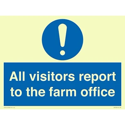 M001 : General mandatory action This sign is made from plastic semi-rigid photoluminescent A3 landscape Sign Text: All visitors report to the farm office