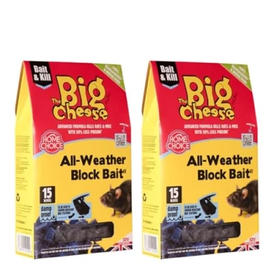 Ready-to-Use Bait: The Big Cheese Home Choice All-Weather Block Bait comes pre-formulated and ready for immediate use, eliminating the need for mixing or handling, making rodent control quick and easy. Effective Rat & Mouse Control: Specially designed to target both rats and mice, this bait delivers proven results, providing efficient control of rodent populations in and around buildings. Moisture-Resistant Blocks: The bait blocks are resistant to moisture, ensuring they remain fresh and palatable even in wet or damp weather conditions, providing consistent rodent control year-round. Universal Fit for Bait Stations: These all-weather blocks are designed to fit all standard tamper-resistant bait stations, making them versatile and compatible with most rodent control setups. 50% Less Poison: The advanced formula contains 50% less poison compared to previous formulations, providing a safer solution while still delivering effective rodent control.