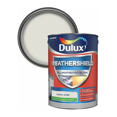 General description Dulux Weathershield All Weather Protection Smooth Masonry Paint is an exterior wall paint formulated with unique Stay Clean technology that protects against dirt and mould growth within the paint film, ensuring long-lasting colour and finish. This high-performance paint is designed to withstand all weather conditions for up to 15 years. Technical specifications Volume: 5L Coverage: Up to 15m²/litre Drying Time: 4 hours Coats: 2 Installation Ensure the wall is dry before application. Apply 2 coats using a suitable brush or roller. Leave 4 hours between coats. Do not use on common or Fletton bricks. Apply only in dry conditions, above 10°C, and when bad weather is not forecast. Usage For best results, mix multiple cans together in a larger container or finish in a corner before starting a new can. Other information Weathershield Promise: If your walls peel, flake, or there is mould growth within the paint film while you live in your home, Dulux will return the value