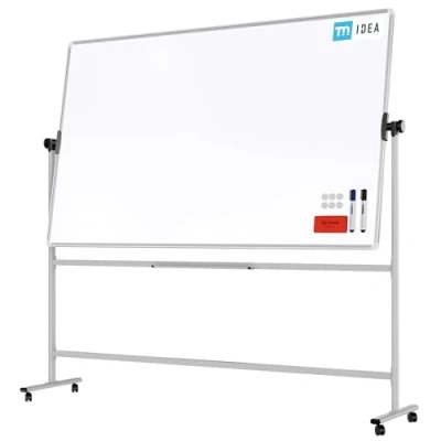PREMIUM QUALITY & EASY TO CLEAN - Crafted from durable, white lacquered steel, the board features a smooth, glossy surface that’s effortless to clean. Perfect for writing key information with dry-wipe markers. PRACTICAL & USER-FRIENDLY - This double-sided whiteboard is mounted on a wheeled stand, making it easy to move and position anywhere in the room. The rotating mechanism allows quick access to both sides, offering twice the writing space. An included aluminium marker tray keeps your essentials neatly organised and within easy reach. MAGNETIC SURFACE - Utilise the board’s magnetic properties to attach notes, documents, posters, or artworks. Ideal for sharing important messages or visual materials in a clear, accessible way. LIGHTWEIGHT YET ROBUST FRAME - Made from anodised aluminium, the frame is both lightweight and strong. The reinforced design ensures excellent stability and long-lasting durability. SIMPLE, INTUITIVE ASSEMBLY - Assembly is quick and straightforward with the included mounting kit and instruction manual. You'll have the board ready to use in no time.