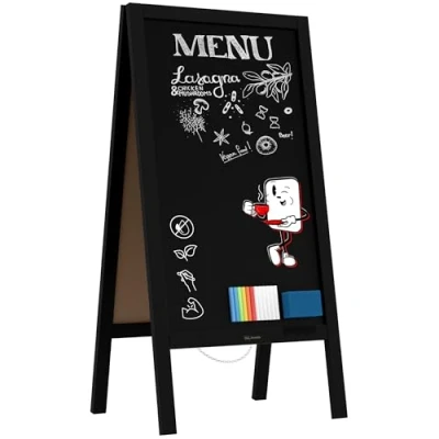 SURFACE - scratch-resistant, high quality surface made of high-density HDF fibreboard varnished black, can be written on both sides. The surface is not waterproof FRAME - light frame made of natural wood, covered with stain and varnish DIMENSIONS – total height 100cm, total width 49,5cm, writing area 74x43cm, frame width 3,5cm, frame thickness 2cm, stand 27cm APPLICATION AREA - acts as an effective menu for catering establishments, pubs and shops USE - ideal for writing on with chalk or chalk markers